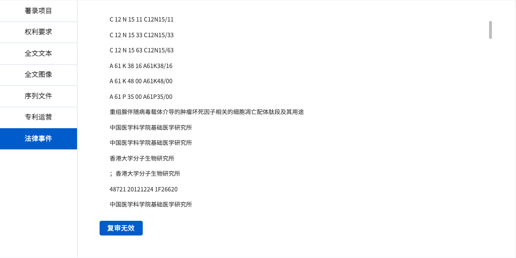 序列详览给予基因专利著录项目、权利要求、说明书、专利全文PDF以及序列文件、运营数据和法律事件信息的查看。